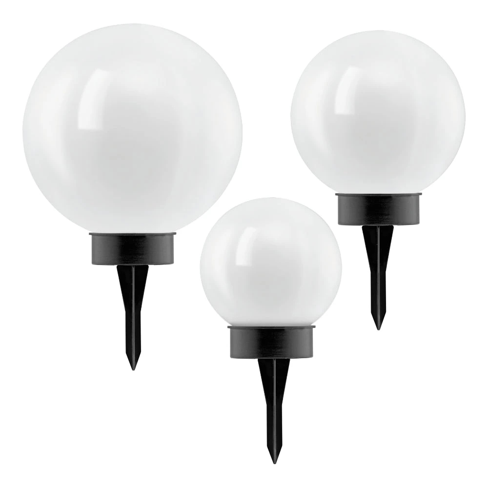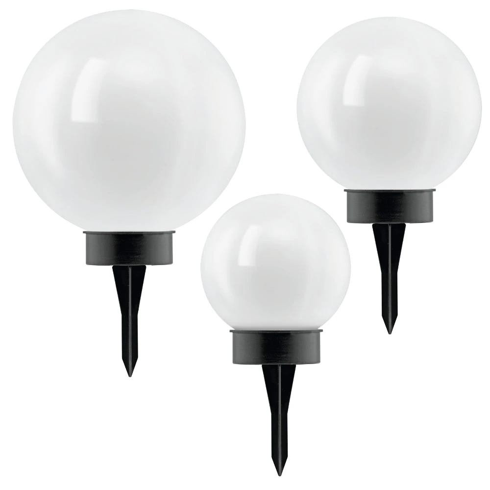 The product is a set of three outdoor solar LED ground spikes featuring spherical white light diffusers and black bases. With a modern design and integrated solar panels, these outdoor LED lights offer an energy-efficient lighting solution to brighten any outdoor space, producing light that lasts between 6-8 hours once charged by the sun. Due to the LED components, the product provides a warm white light. The product is ideal for illuminating garden paths and driveways due to its IP44 rating.