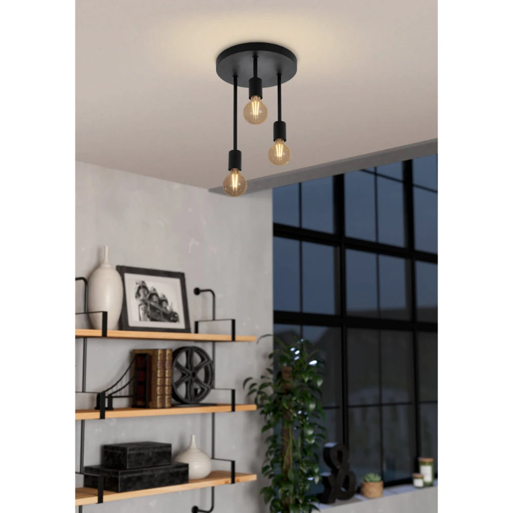 The WILMCOTE ceiling light has a round black metal base with three black lamp holders attached at various heights. The ceiling light has a minimalist look that works well with modern and Scandinavian interiors. The product provides attractive lighting for any space, whether in the living room, bedroom or hallway. The product has E27 lamp holders and requires 3 x E27 lightbulbs, which are not included.