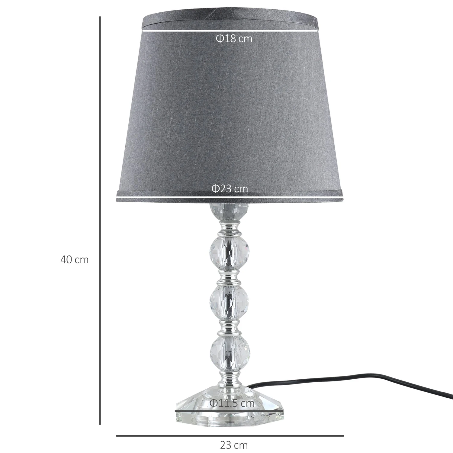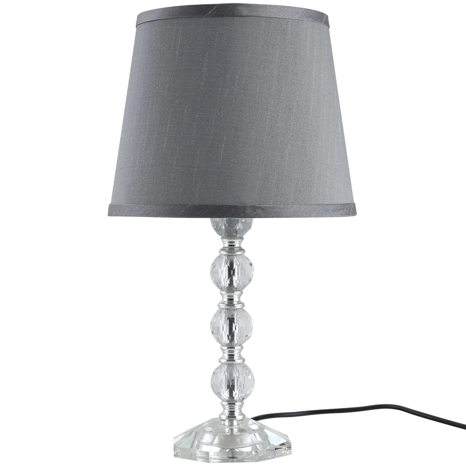 Bring glamour to the bedside table with this lamp from HOMCOM. A glass base, it is formed into a multiple crystallite ball design for elegance, with a wide bottom which keeps the light balanced and stable. Its clear and fragmented finish creates a beautiful shining aura at night. A grey shade is placed on the top, in a slightly silky-look finish which blends into your home with ease. Fitted with a standard E27 bulb base, and is controlled by the switch on the electrical cord.