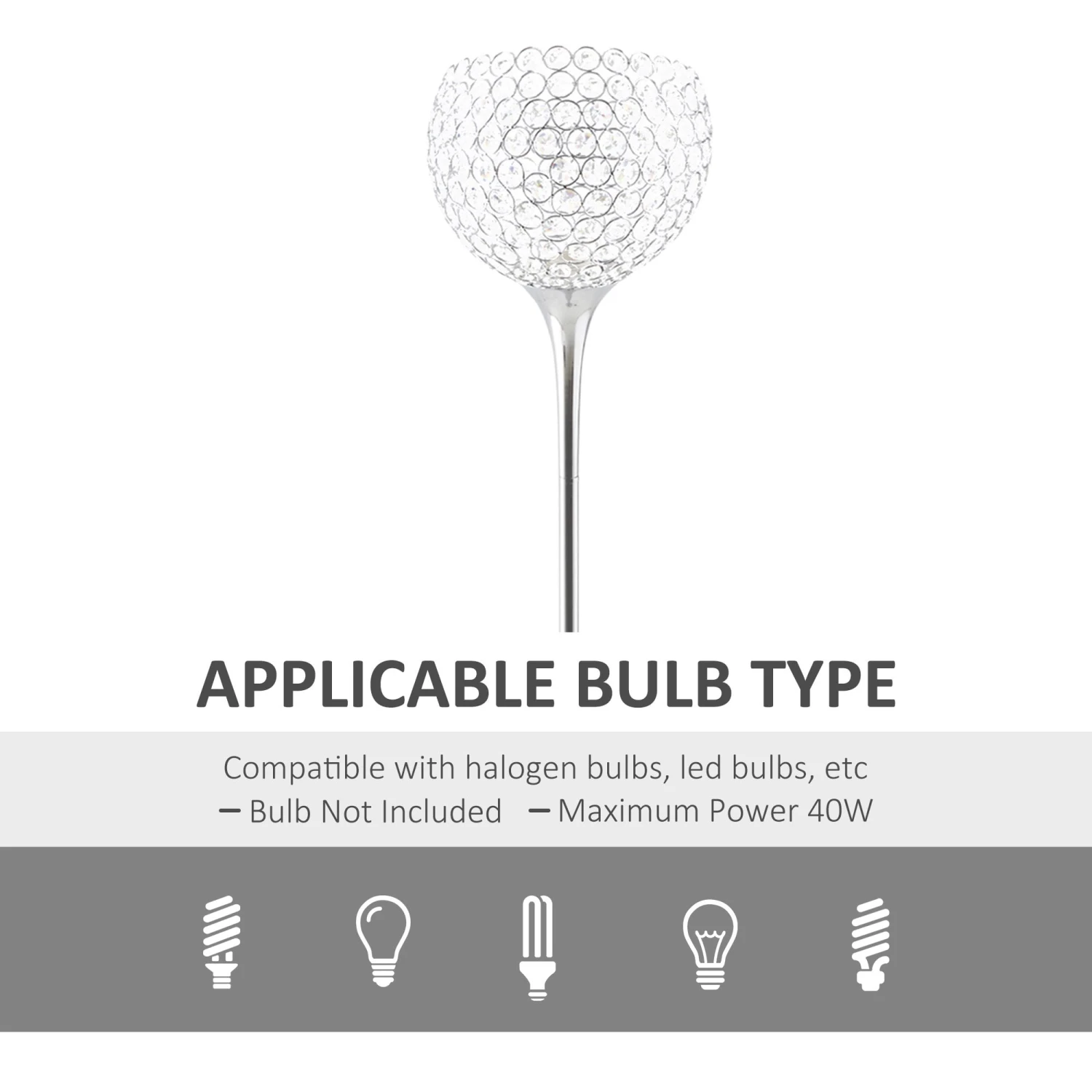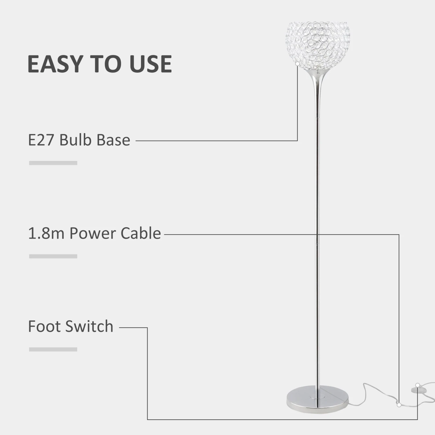 Light up your home in effortless elegance with this tall standing lamp from HOMCOM. The modern floor lamp, with a shining crystal shade, will create romantic and warm light. Using solid metal frame with silver finish and its sturdy base gives LED floor lamp an elegant look which is balanced and stable. The Contemporary style is exquisite and chic, suit for living room, bedroom, caf?©, hotel etc. Equipped with a foot switch for easy operation and require an E27 bulb (not included).
