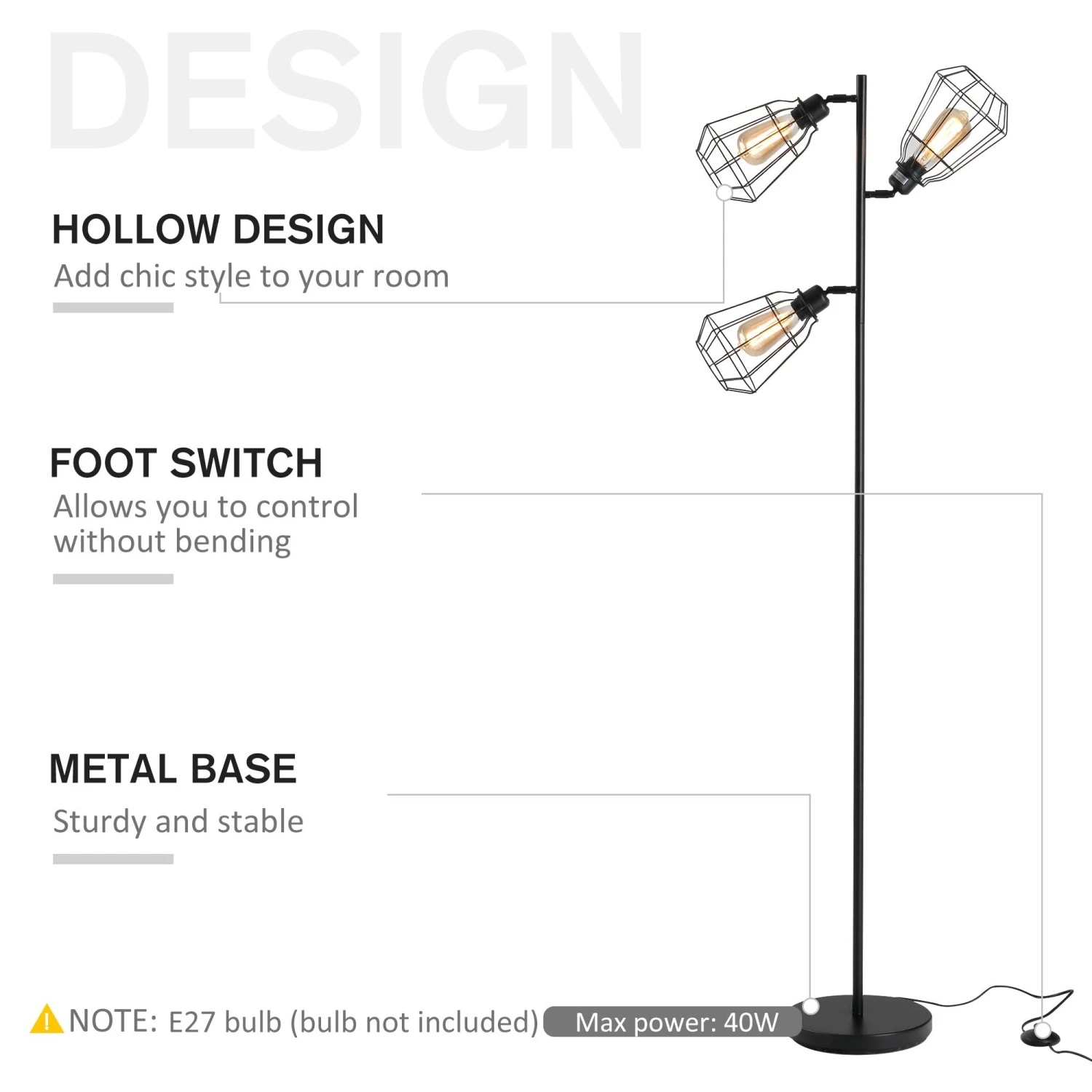 Bring beautiful industrial styling into your home and beyond with this floor lamp from HOMCOM. Using steel for the tall and slimline frame, it features three lights, all protected by a large birdcage shell for safety. Each light can be moved up/down and left/right allowing you to illuminate towards any position needed. The base is round and wide to keep the structure upright, and it is finished with a foot switch to turn it on and off easily.