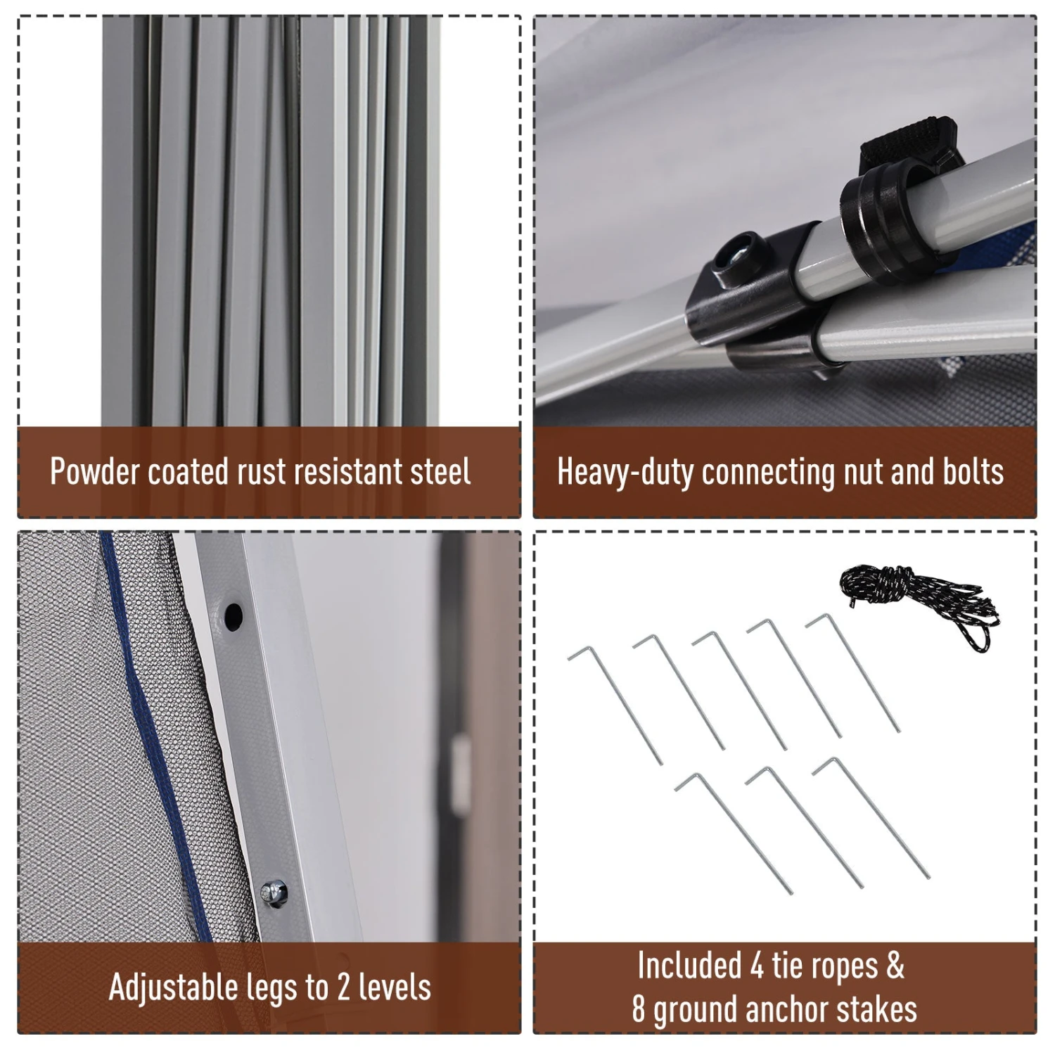 - Netted walls for protection against mosquitoes and bugs. Front net wall can be tied back