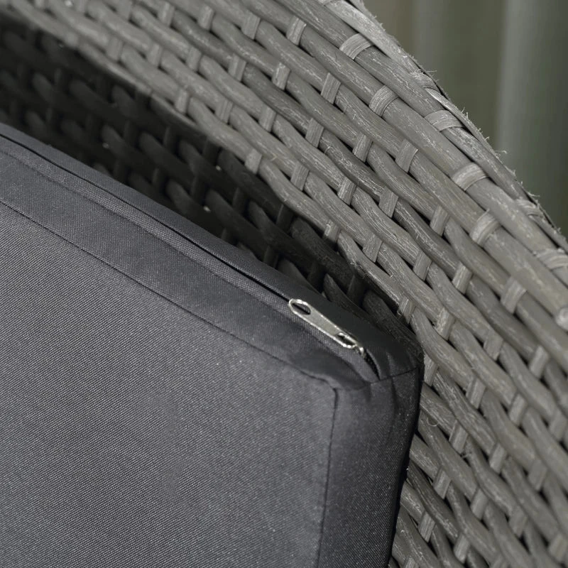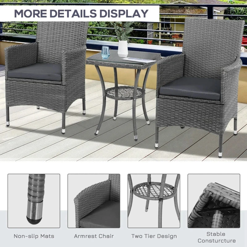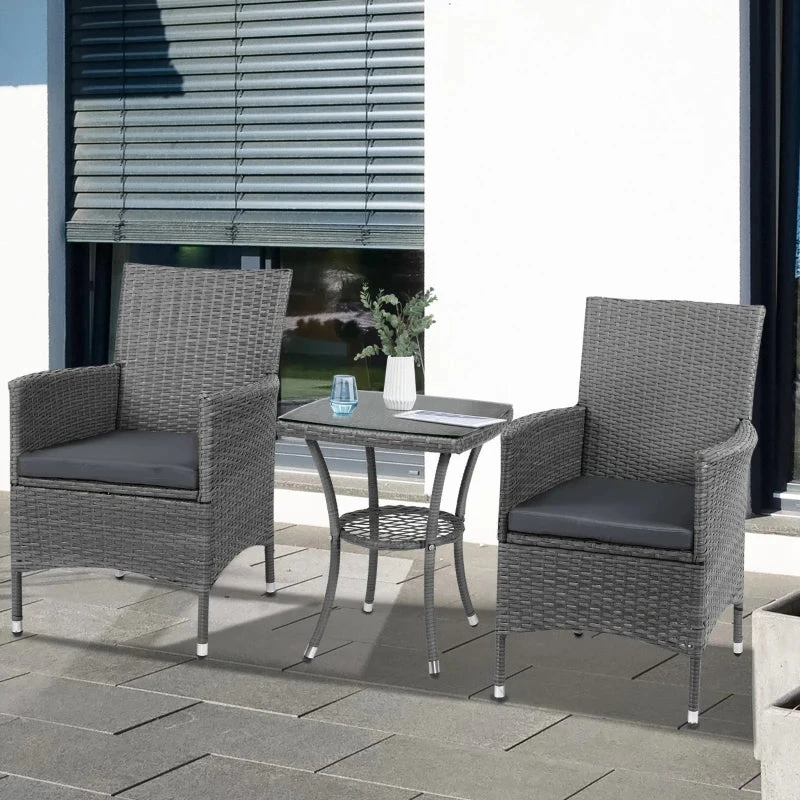 This Outsunny outdoor bistro set is great for any patio, garden, porch and similar spaces. Frames of the rattan bistro set is made from powder coated steel mean a strong structure, wrapped in plastic wicker for garden rattan style. UV and water resistant. Matching table gives a handy side surface, with a safe and sleek glass top. Repeat and use, season after season.