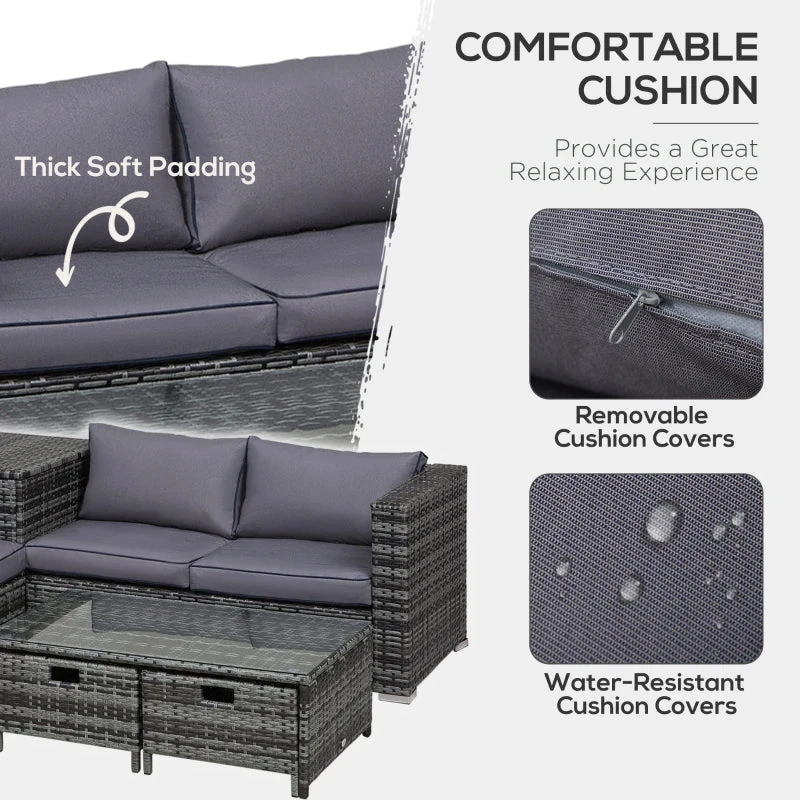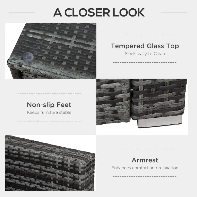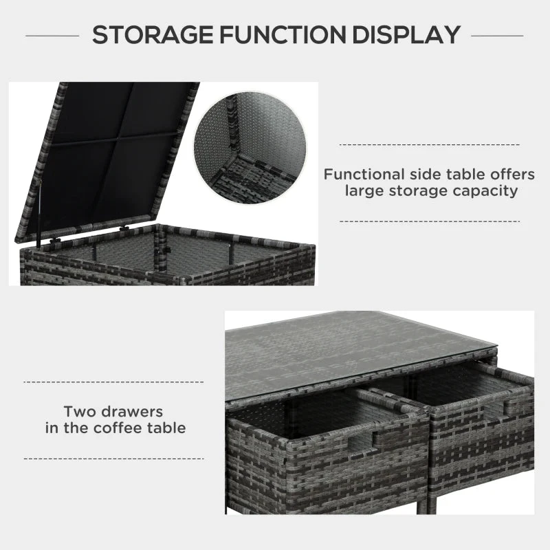 Generous in size and stylish in design, let this outdoor corner sofa from Outsunny take the lead for your outdoor leisure times this season. The small garden furniture consists of four pieces – two two-seater sofas, a tall storage corner table and an oblong coffee table with drawers, giving you plenty of room to relax all day by yourself or with others. Discreet storage is located both on the tall corner table of the garden furniture sets, with two drawers in the oblong coffee table.