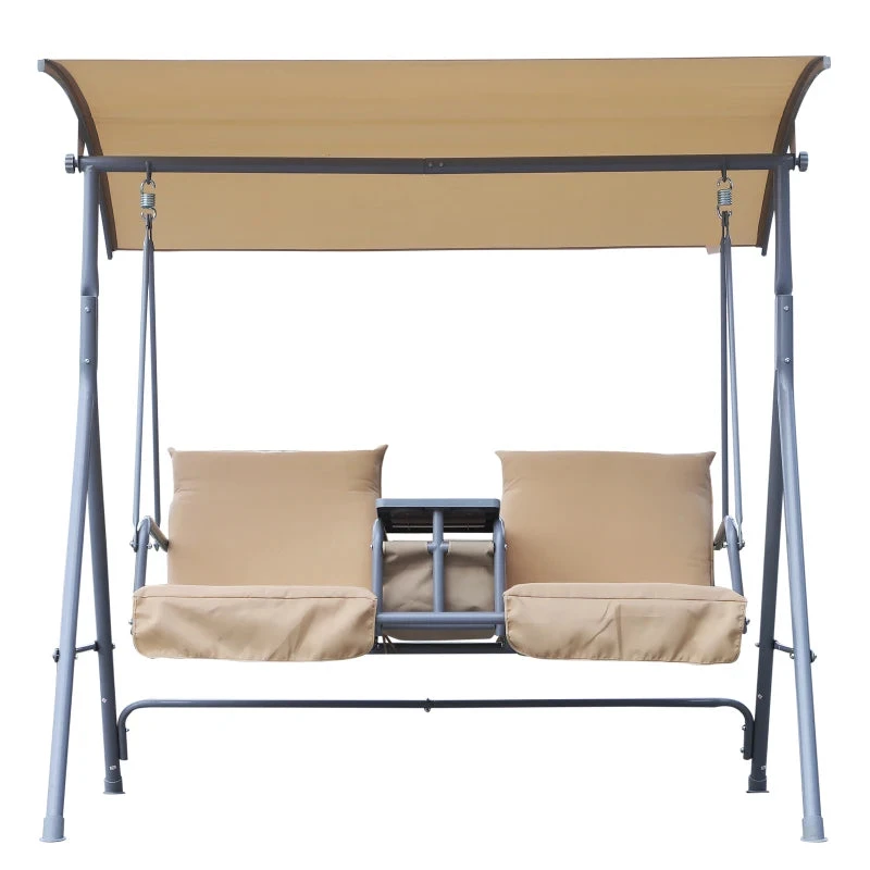This Outsunny swing chair is a must for anyone who loves their garden. Using tough, heavy-duty metal to form an A-shape frame which effortlessly supports up to 180kg, the swing bench is fitted with a double seat swing seat. A table is fitted in the middle so you can keep smaller things close to you. A top canopy protects against light weather UV rays and direct sun glare from above. sunlight and wind. Comes with padded seats for comfort. So sit back, and relax.