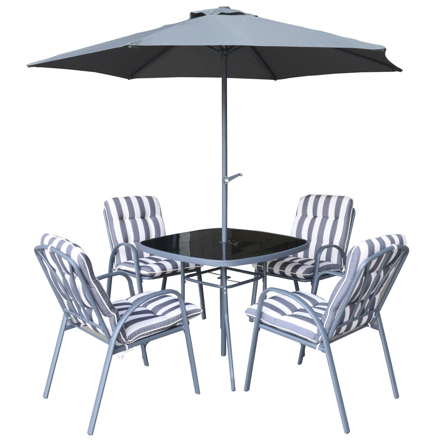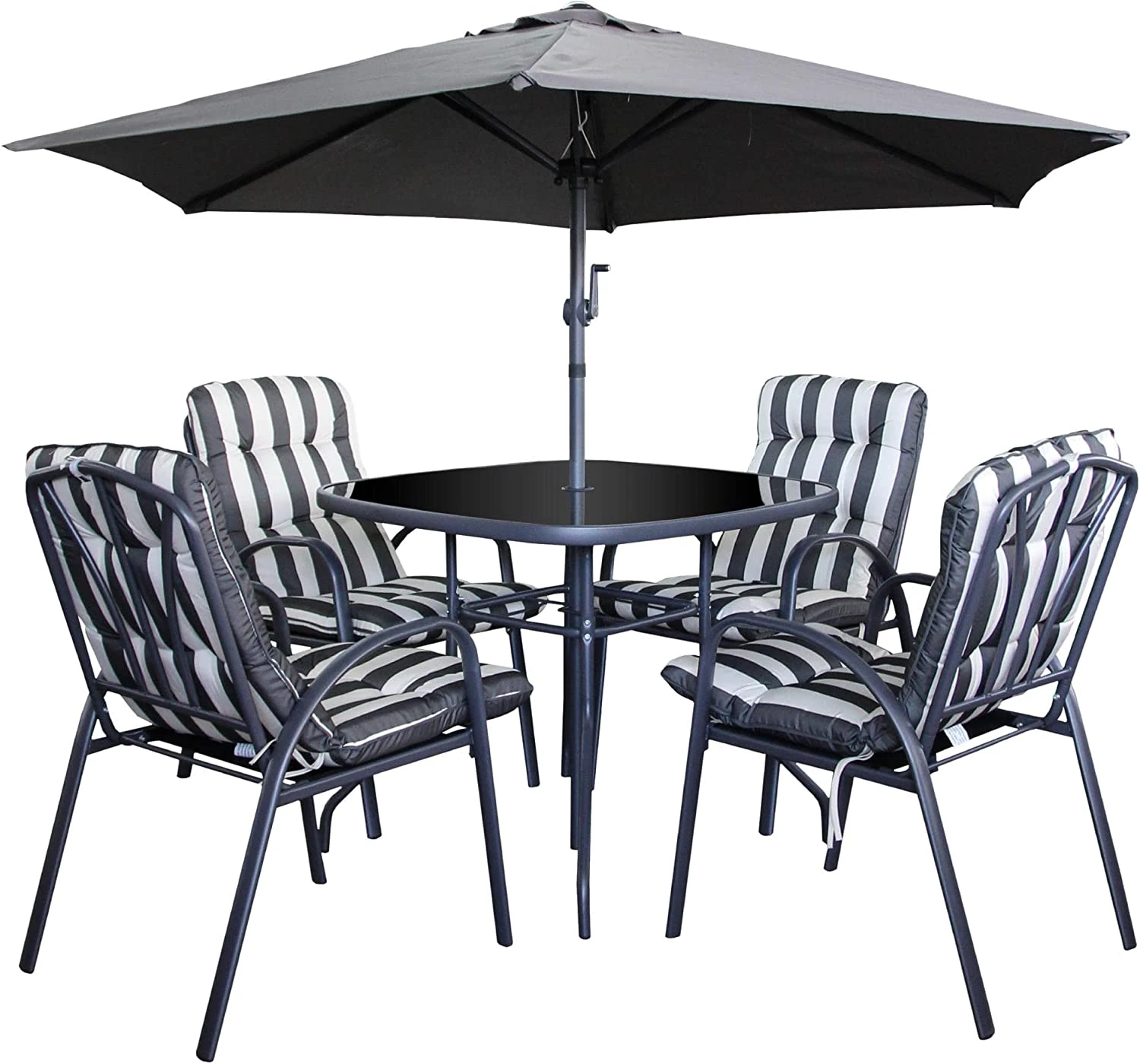 Bring a piece of your home outside with the Windsor 6 piece patio set – a steel furniture set complete with seat cushions for that little bit of outdoor luxury. With a grey and beige colour scheme, you can effortlessly match the design of the 6 piece patio set to any existing furniture and the glass table top makes it quick and easy to clean after use. As well as being a great garden 6 piece patio set for alfresco dining, the seat cushions make the Windsor chairs extremely comfortable, so sitting in one with a book and a chilled glass of wine is also an ideal way to make the most of the summer months. As with most of our patio sets, the 6 piece patio set comes complete with parasol to provide that perfect shady spot.