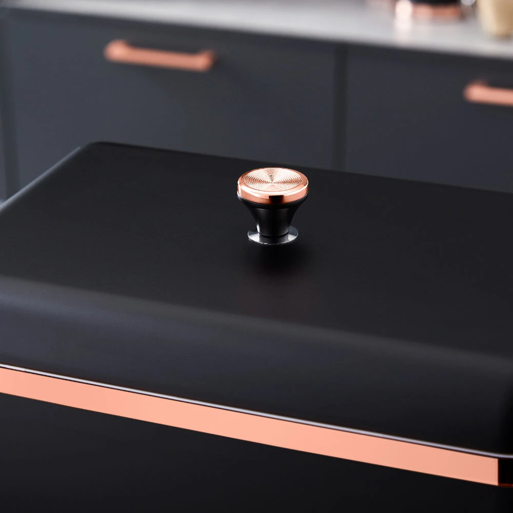 Wrapped in a staple design feature for today’s modern home, the durable carbon build of this bread bin presents a reliable and highly styled storage compartment for your baked goods. The carbon structure is finished with a coating of matte black, with rose gold tones for a tasteful finishing touch to compliment your kitchen environment. The removable bin lid provides maximum access to the inner compartment for easily retrieving of your breads and pastries. This bread bin measures H24 x W33 x D23cm and requires only a simple wipe clean to make for easy maintenance of its on-trend finish.