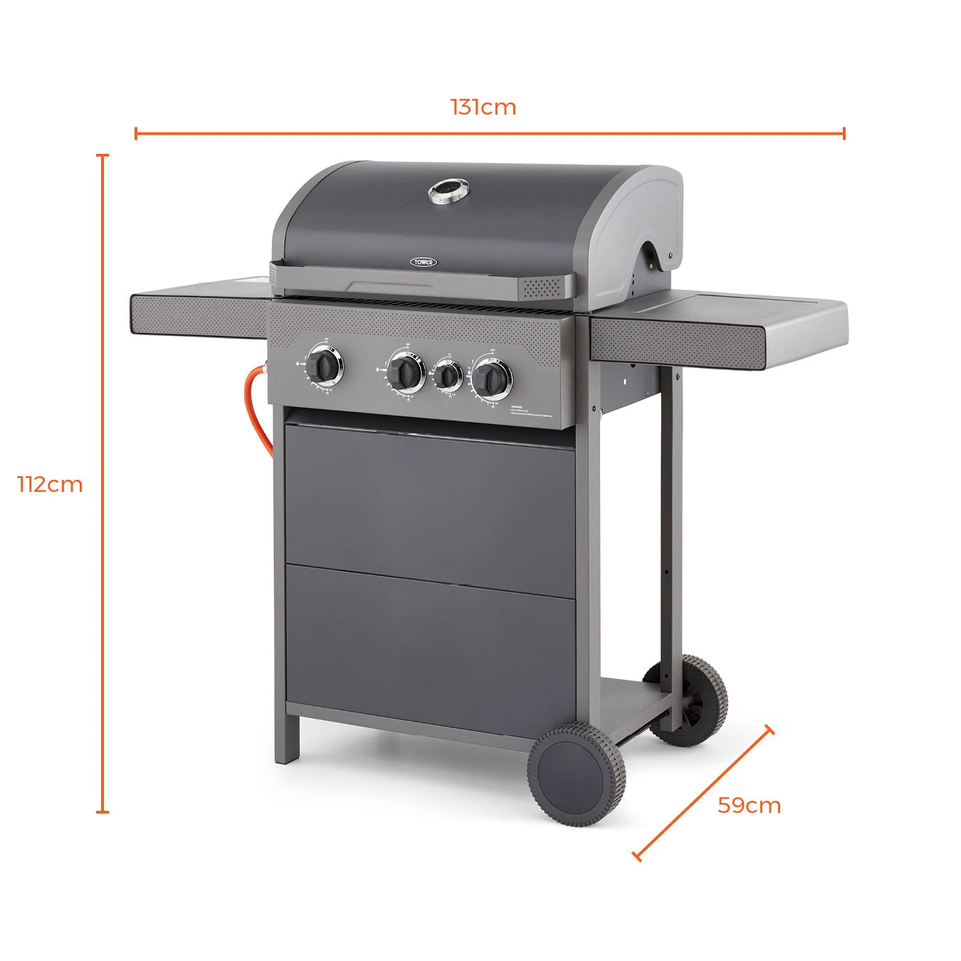 This Tower Stealth Three Burner BBQ lets you grill a wide range of succulent meats to a perfect texture and consistency using the precision heat thermometer. The porcelain enamel coated cast iron grill is durable and retains large amounts of heat, providing efficient grilling. This BBQ features a side burner for grilling, sauteing and extra storage for sauces. A fat tray collects all of the excess fat, which can be removed and easily cleaned to maintain performance. Integrated robust wheels make for easy portability and an included front panel disguises the gas bottle for a more pleasing visual appeal. Easy to assemble.